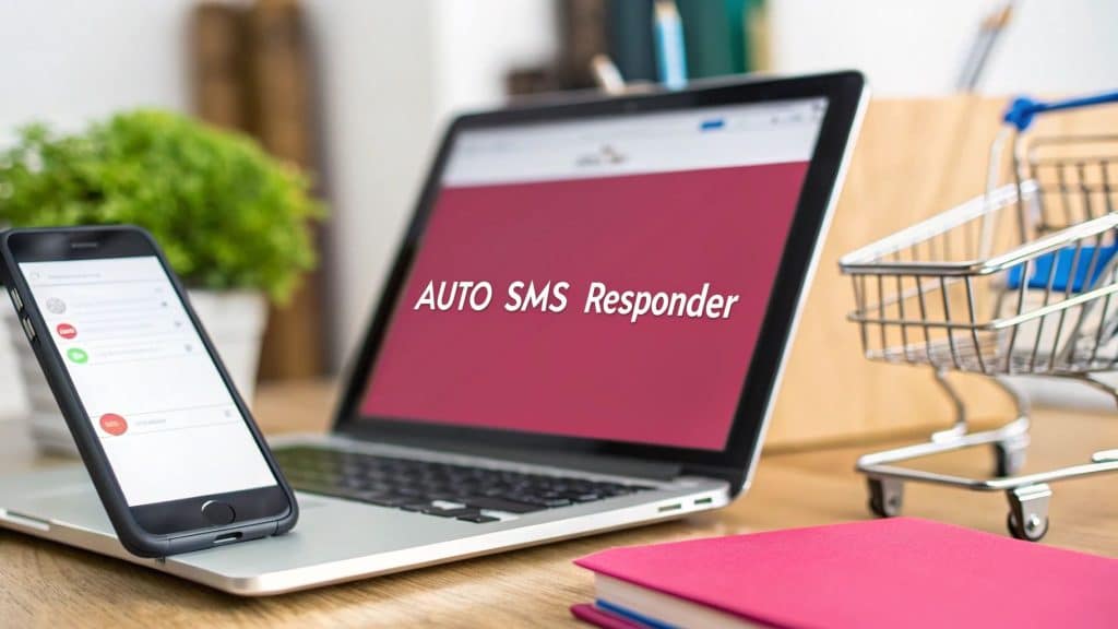 Think of an auto SMS responder as your automated sales recovery agent. It’s a system that automatically fires off a pre-written text message when a specific event happens—like a shopper leaving your site with a full cart. For any e-commerce store, this is an incredibly powerful way to re-engage distracted shoppers and pull back lost sales, all without you lifting a finger.