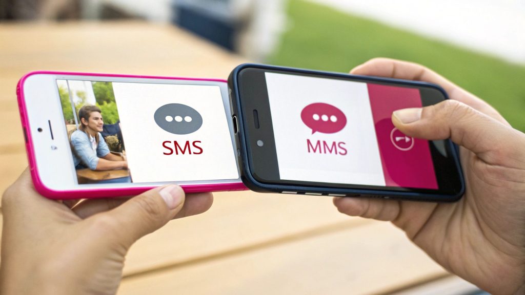 Let’s get straight to it: the big sms and mms messaging difference boils down to one thing. SMS (Short Message Service) is your classic, text-only workhorse. MMS (Multimedia Messaging Service) is what you use when you want to send pictures, GIFs, videos, and other media.